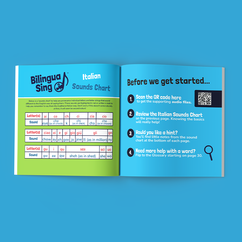 Many first Italian word dictionaries leave you guessing as to what the words mean and how to pronounce them. We address this problem by providing a full pronunciation guide, a Italian-English glossary and audio files where you can listen and practise with confidence. Written by a mum of 3 and teacher of Italian since 2003, BilinguaSing has received many awards and accolades including: