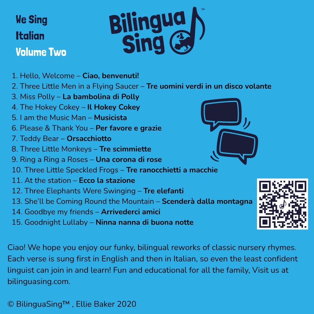 Hi! I’m Ellie Baker, teacher, mother of three and writer-director of the BilinguaSing We Sing Italian songs. I created these educational and fun nursery rhymes because I wanted songs which parents would enjoy too (not just tolerate)!